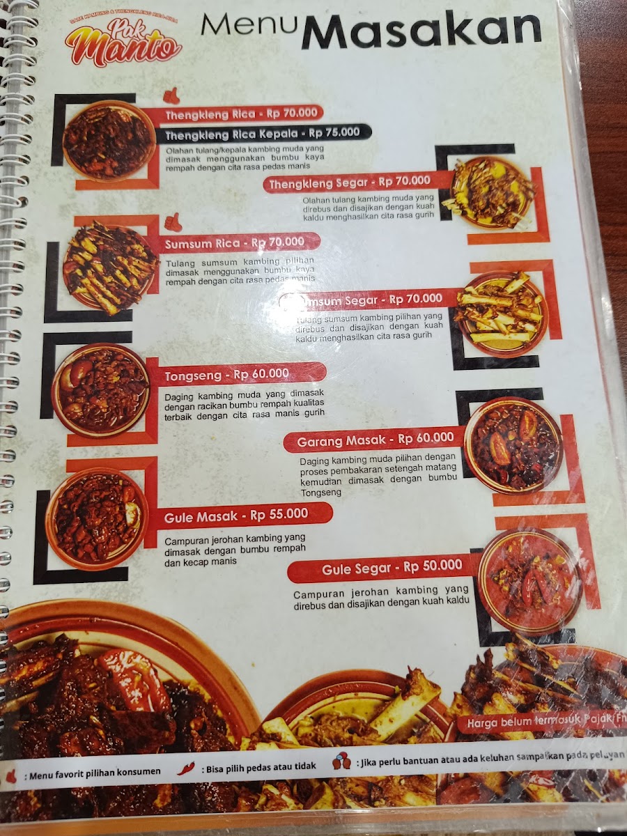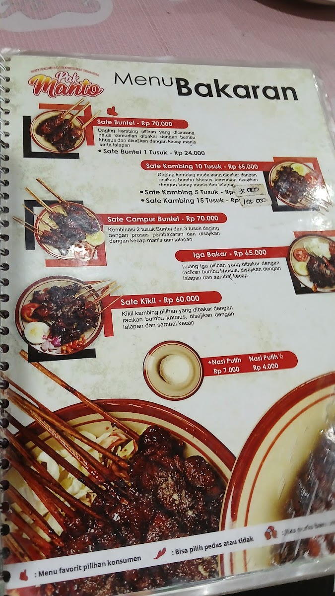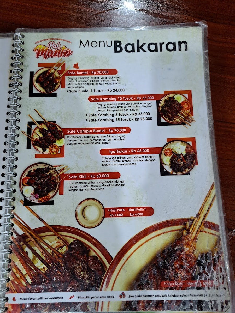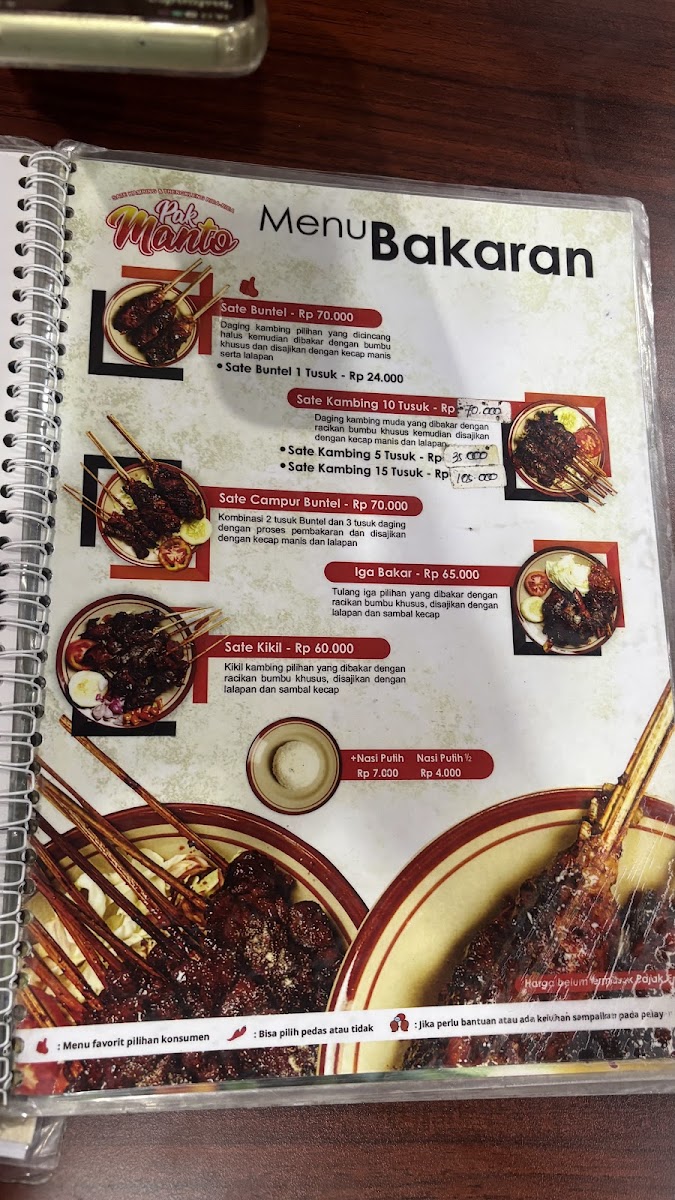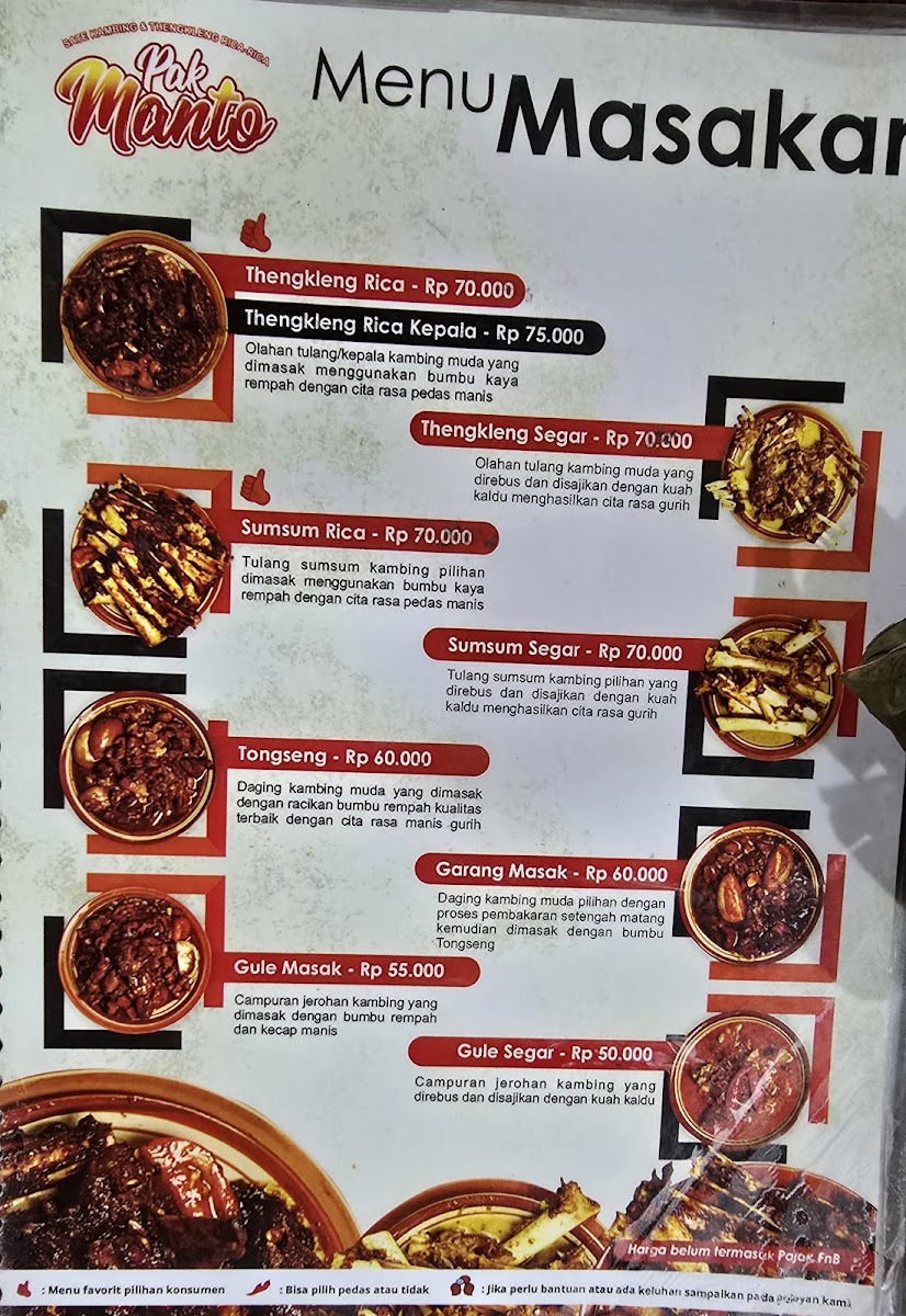 Introducing the menu at Sate Kambing & Thengkleng Rica-Rica Pak Manto is a culinary adventure not to miss in Solo. Nestled on Jl. Honggowongso, this restaurant embraces the heart of Javanese cuisine with its signature dishes. The Thengkleng Rica-Rica, a spicy goat rib stew, stands out for its robust flavors, combining sweetness and heat that tantalizes the palate.